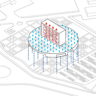 Two functionally different volumes - Interest Education Center as horizontal base and Innovation Centre as vertical accent - are merged together through common public space. Four squares with varied characteristics are created as the main organizing elements. They begin as outdoor area and continue into the building becoming a part of it thus breaking down the borders between outdoor area and indoor space. The building is designed as a part of landscape with multifunctional green roof that serves as continuation of the park.